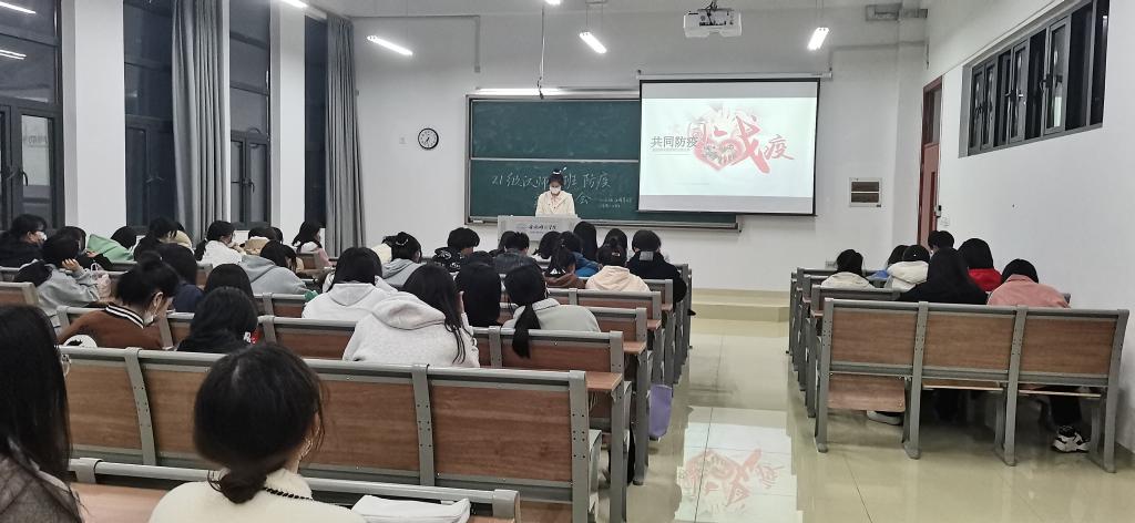 为了做好同学们在疫情防控期间的心理工作,进行思想引导,增强同学们的防护意识,2022年3月28日晚,2021级汉语言文学(师范)2班全体成员在博学楼108教室开展防疫主题班会,班级委员对防疫展开一系列介绍。