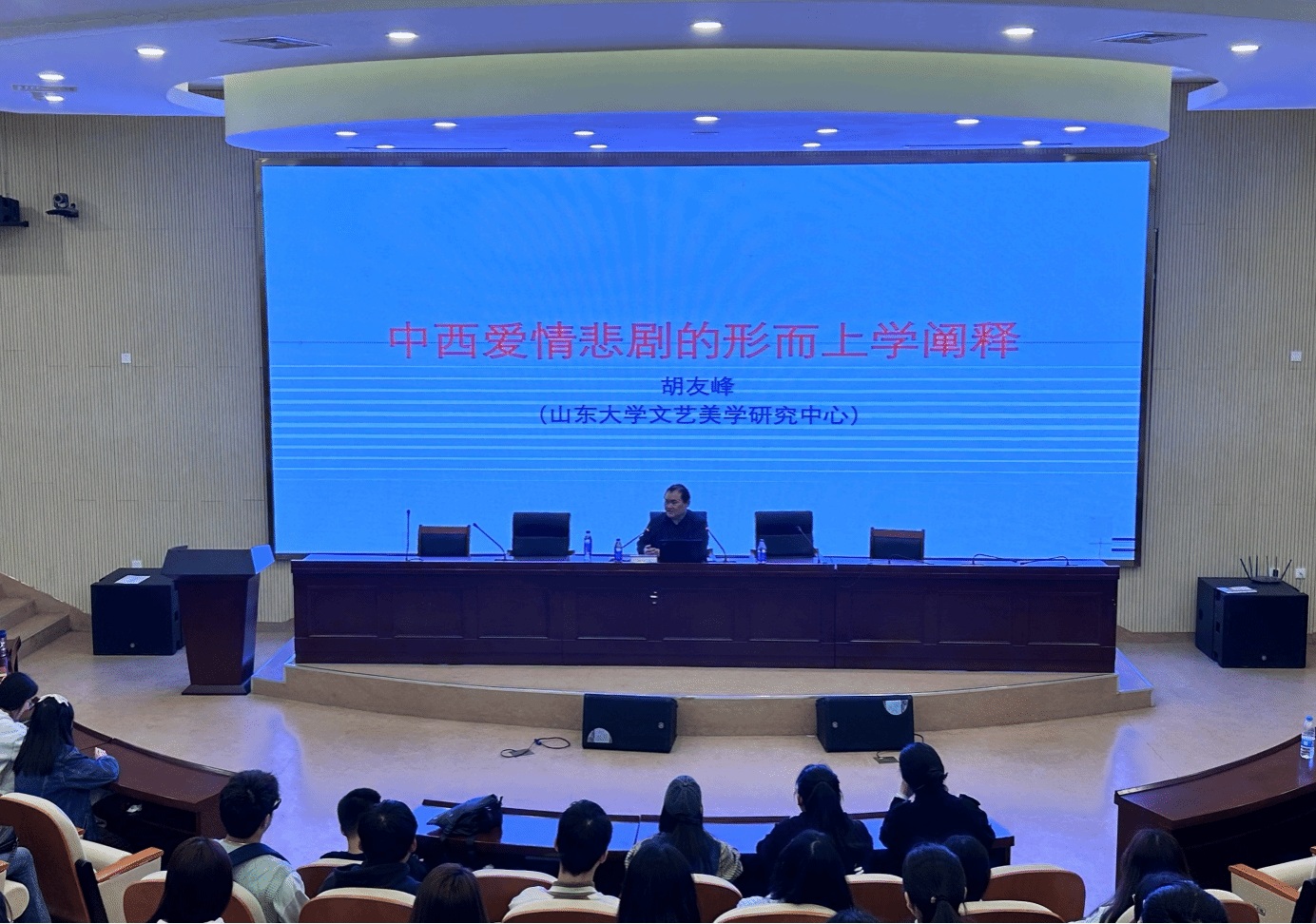 4月12日,山东大学特聘教授、二级教授、博士生导师胡友峰应邀为黄色片免费看师生作题为《中西爱情悲剧的形而上学阐释》学术报告。报告会在滨湖校区学术报告厅举行,黄色片免费看师生150余人参加。黄色片免费看院长何旺生主持报告会。