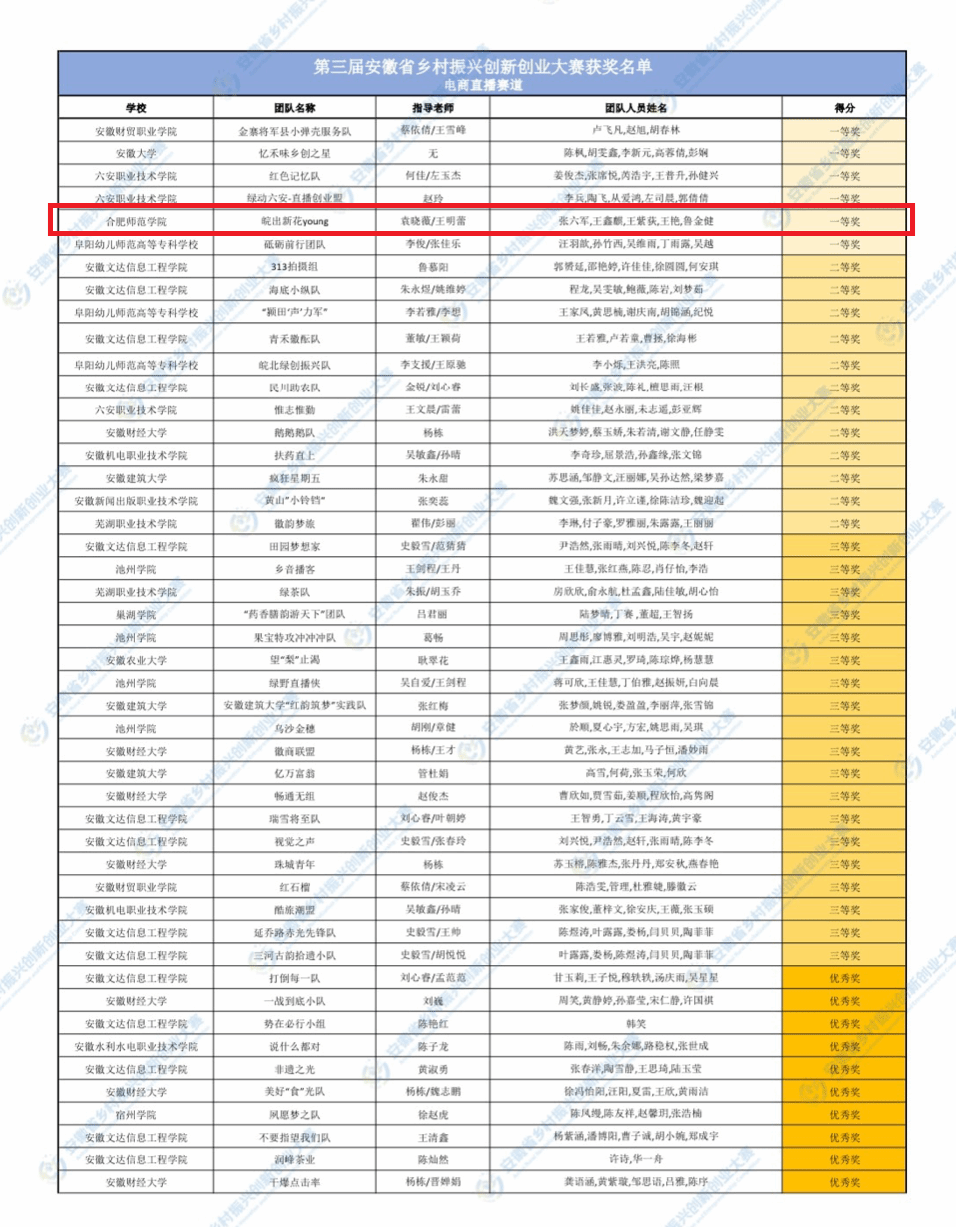 近日,第三届安徽省乡村振兴创新创业大赛评选结果揭晓,黄色片免费看袁晓薇教授指导的“皖”出新花Young团队斩获电商直播赛道一等奖。团队成员共5人:张六军、王鑫麒、王紫荻、王艳、鲁金健,均来自2024级网络与新媒体专业(专升本)。