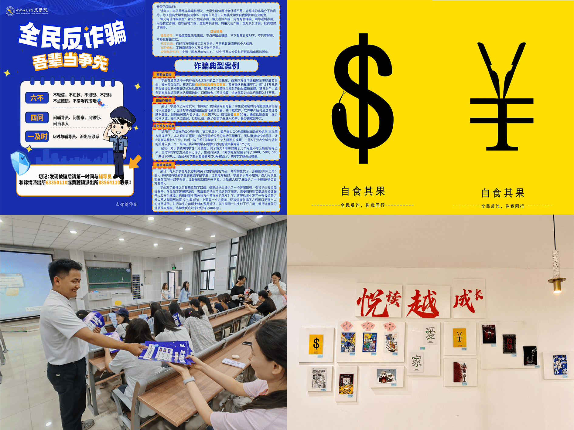 把握青年学生成长维度,以校园生活场景全程发力。引入学生宿舍生活场景,设计并印制反诈防诈安全知识宣传单页,汇集典型诈骗案例情节回溯、案情分析以及防范应对措施等内容,总结“六不”“四问”“一及时”防诈口诀,将校园电信诈骗典型案例作为反诈防诈教育的生动教材,并在学生宿舍进行分发,鼓励学生将宣传单页在宿舍醒目处张贴上墙。引入班级主题活动场景,将反诈防诈教育作为班级主题班会的重要议题,每次班会充分学习讨论,并定期召开反诈防诈专题班会,解读校园典型诈骗案例,叮嘱防范注意事项。以班级为单位,组织主题观影、反诈案例我来讲等学生广泛参与的班级活动,将反诈防诈教育有机融入班级活动场景全过程。引入学生校园活动场景,组织“同绘反诈图景 共筑安全校园”创意海报设计大赛,收到各类创意海报五十余份,评选出优秀作品十余份。并于2025年4月,在滨湖校区“集萃文苑”一站式社区举办优秀作品展,开展主题团日活动,拓展开展反诈安全教育的实践内涵。