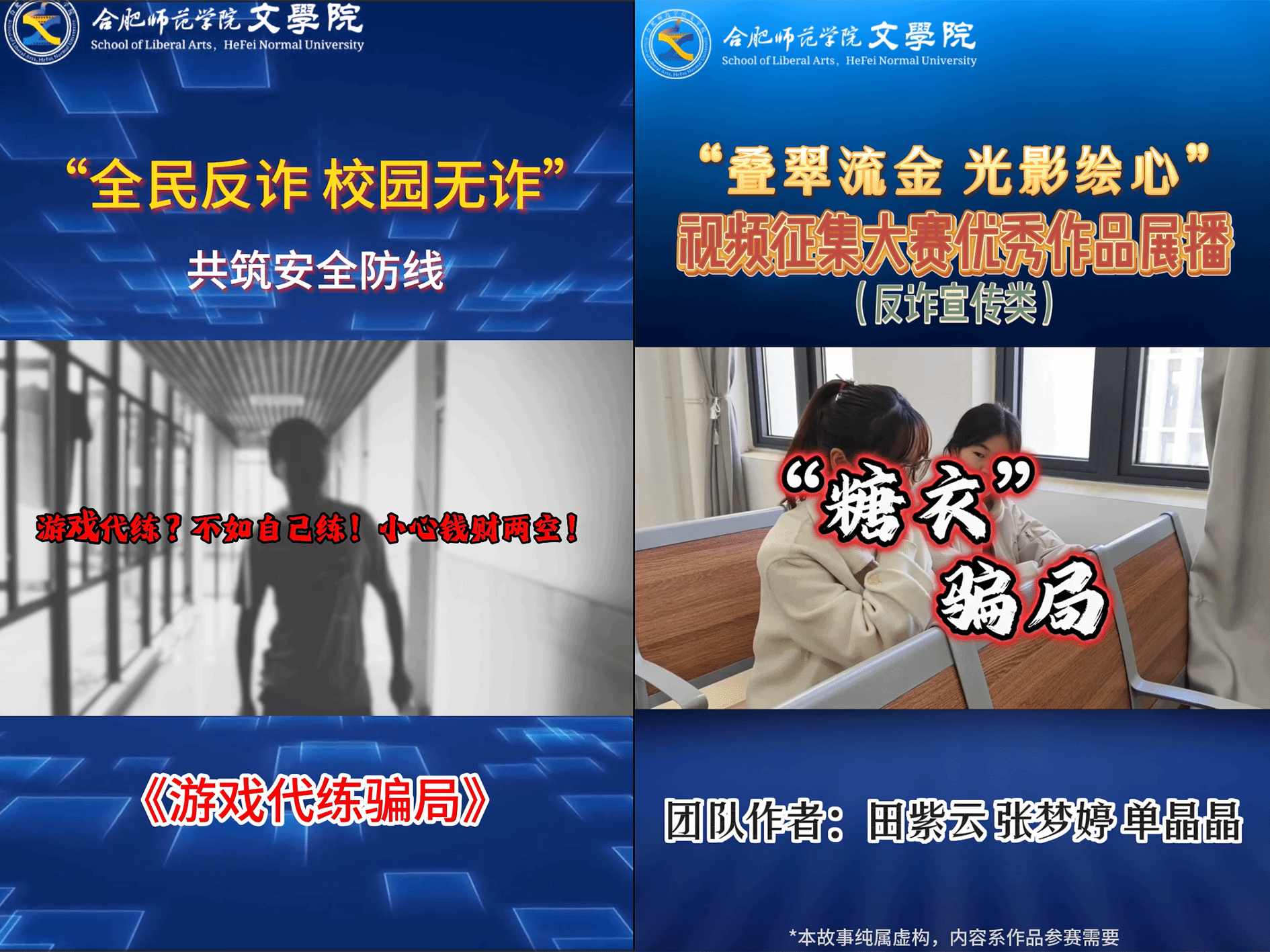 深挖学院专业内涵维度,以专业实践技能持续发力。注重发挥网络与新媒体专业特色优势,黄色片免费看融媒体中心组织策划并着手拍摄反诈防诈系列主题短片,立足“合肥师范学院黄色片免费看”微信视频号网络平台,推出“全民反诈 校园无诈”——游戏代练骗局、“糖衣”骗局等系列微电影,将近年来具有普遍代表性及典型性的校园诈骗案例进行微电影剧本改编,招募青年学生进行生动演绎,将常见的典型诈骗案例情景再现。让青年学生的“身边人”直接讲述校园场景下发生的“身边事”,真正使反诈防诈教育深入人心,触及学生生活场景方方面面。系列微电影在视频号发布以来,视频播放量达千余次,受到了广泛的良好影响。