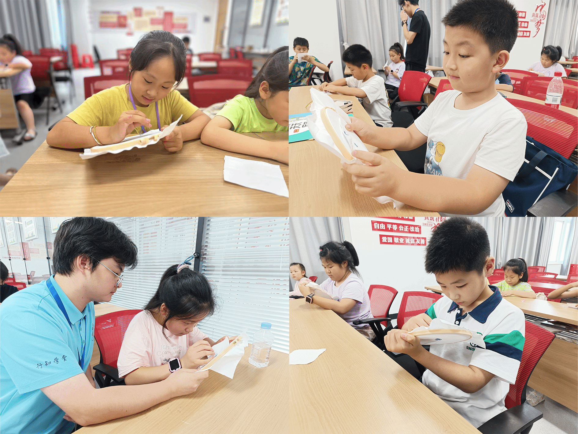 活动采用“视频授课+线下指导”的创新模式,打破时空限制,让非遗传承更贴近少年儿童。行知学堂“小先生”团队提前与非遗传承人何冬霞深入沟通,针对挑花技艺的“挑、钻、绕、结”等核心针法设计分步教学方案,确保每个细节通过云端清晰呈现。线下则由行知学堂“小先生”,分组发放内含绷架、彩线、网格布等工具的材料包,并辅助学员调试设备、固定绣布。