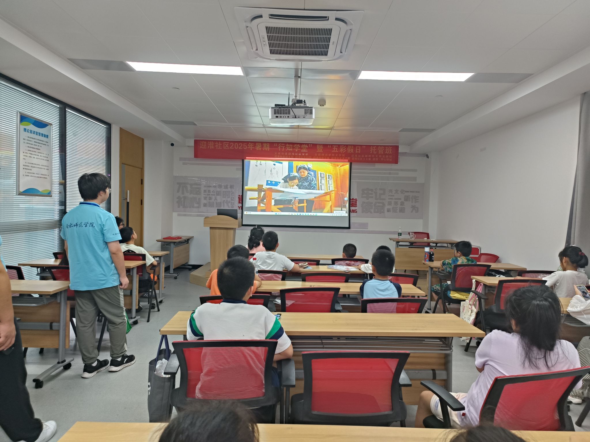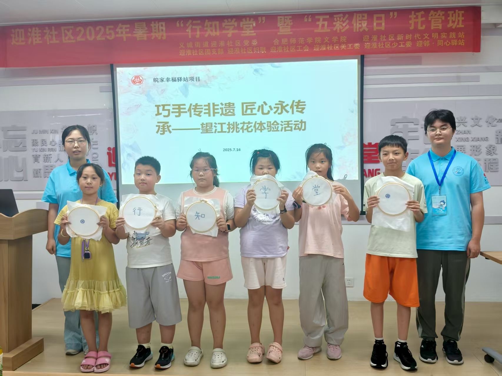 为帮助学员深入理解望江挑花的文化价值,活动特别设置“非遗小讲堂”环节,播放何冬霞对望江挑花非遗的介绍视频,带领小朋友们云游望江挑花艺术馆。馆内陈列的挑花作品琳琅满目,每一幅都蕴含着深厚的文化底蕴。而艺术馆的迎宾厅,更是仿照当年望江挑花进入人民大会堂安徽厅的装饰场景复制而成。望江作为“三孝之乡”,艺术馆内还特别展示了以二十四孝为主题的挑花作品,传递着孝道文化的深刻内涵。