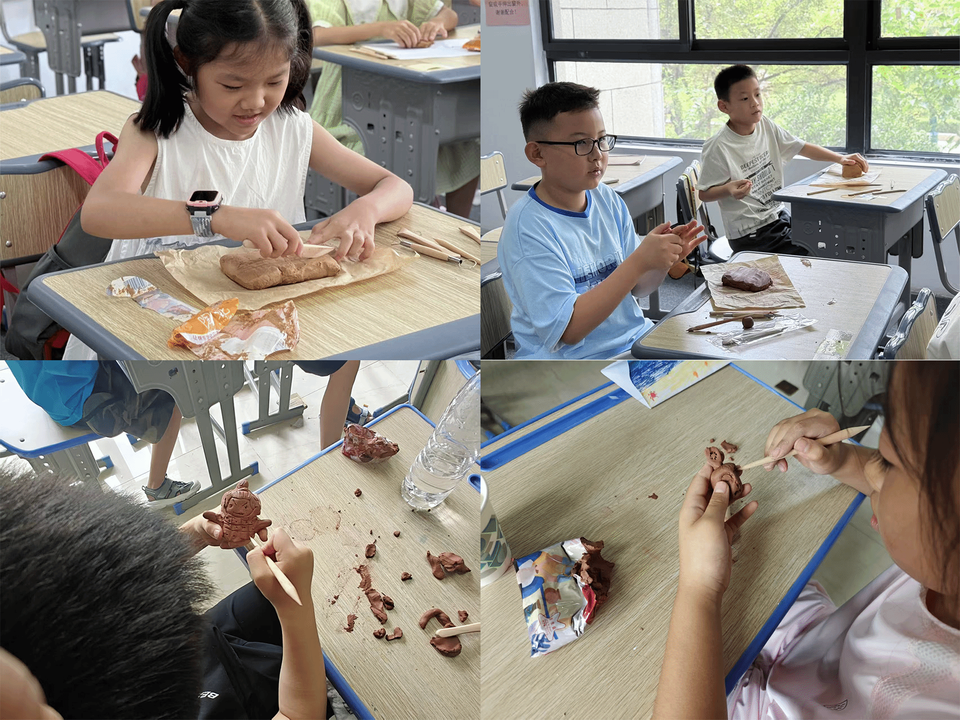 在对兵马俑有了基本的了解和认识后,孩子们迫不及待地开始了手工环节,小先生们为每位孩子分发了工具和陶泥,孩子们发挥着自己天马行空的想象力,开始制作自己想象中的小小兵马俑。现场的欢声笑语萦绕在教室当中。过程中不仅拉近了孩子们和历史的距离,也让他们感受到了制作兵马俑的不易,在感叹于古人的智慧的同时也在心里埋下了想要了解历史的小小种子。虽然孩子们制作出来的兵马俑线条稚嫩甚至有些千奇百怪,但是充满了孩子们的创意与热情。