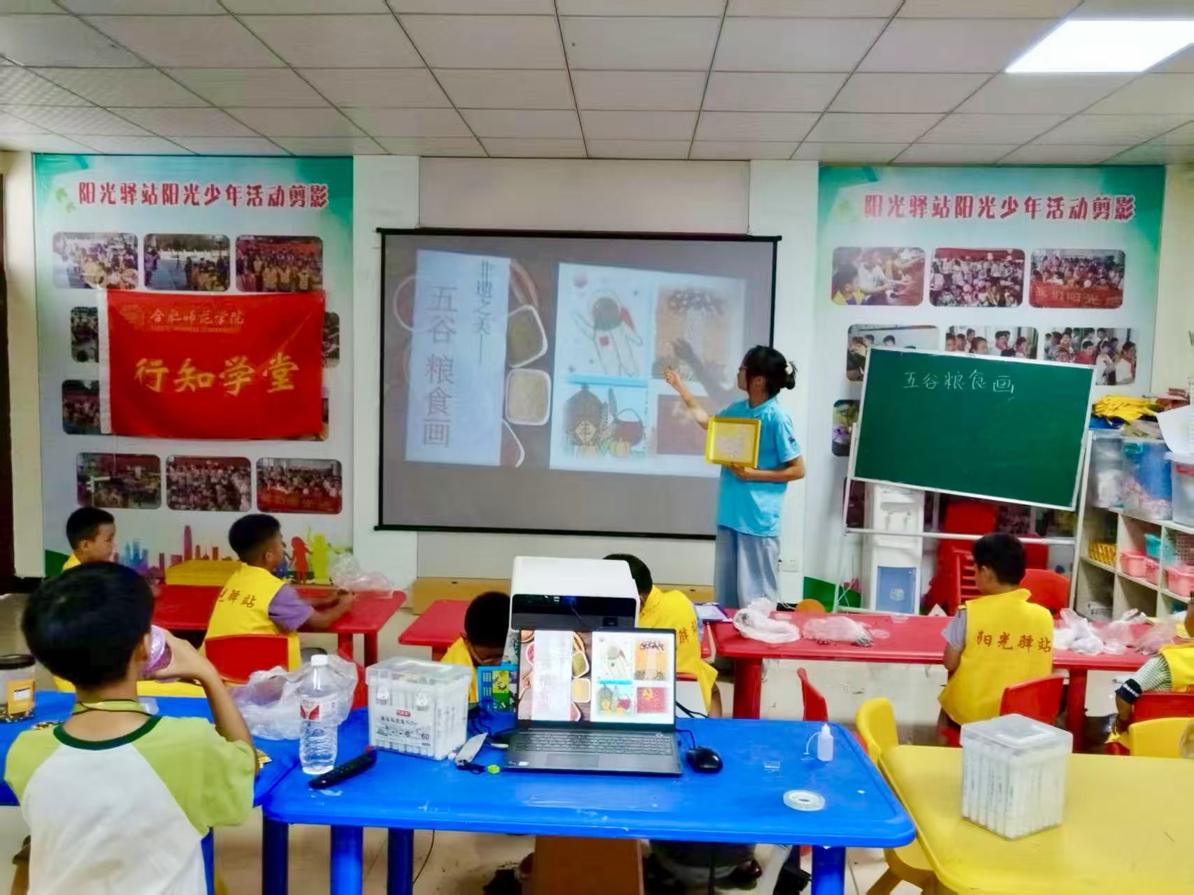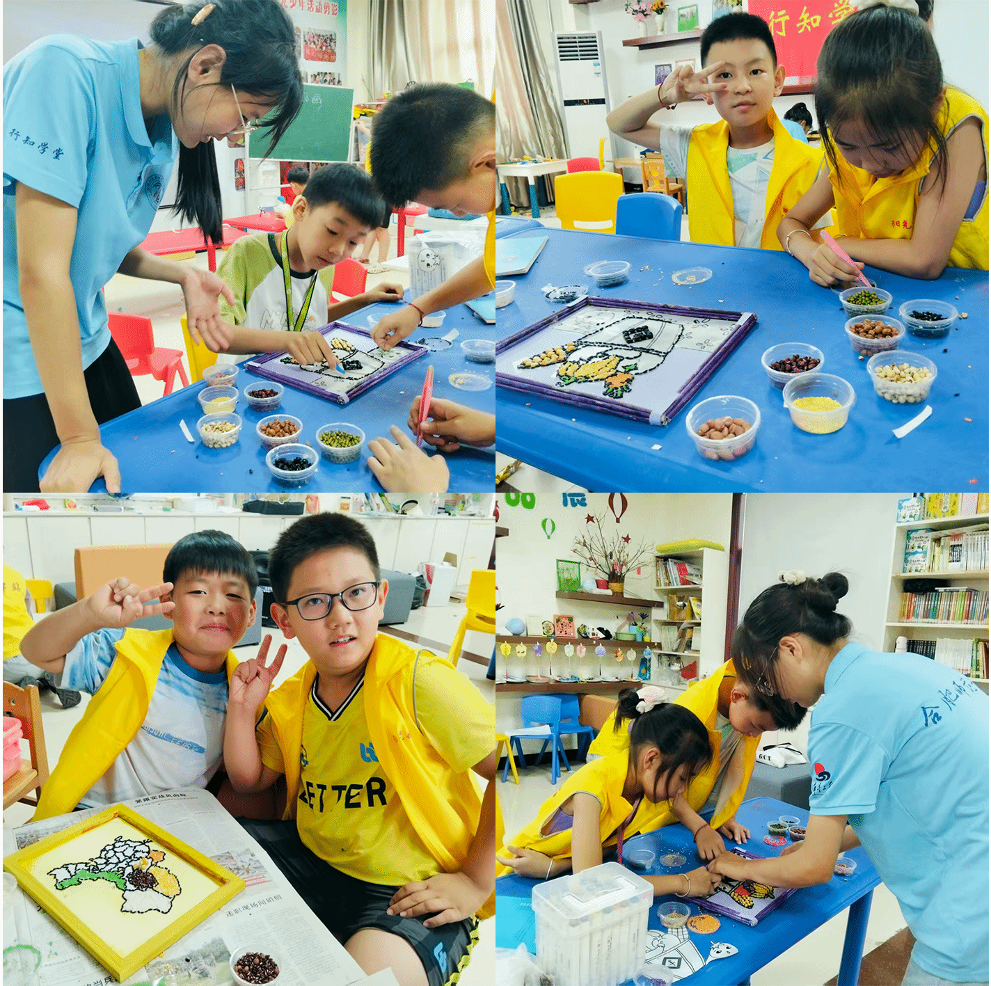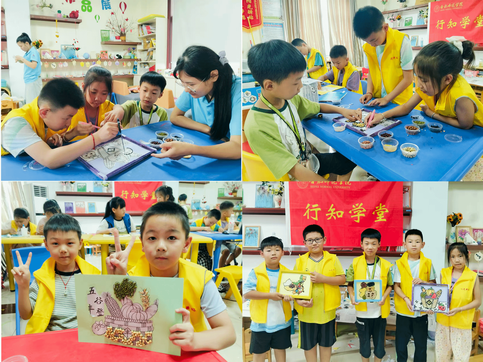 7月22日,为更好弘扬中华优秀传统文化,五河行知学堂再出新招,在蚌埠市五河县城关镇吴家嘴社区举办了一场“非遗粮食画创作”主题手工创作活动。此次活动巧妙融合自然之美与文化之韵,以红豆、绿豆、大米、黄豆、黑豆 、玉米粒、黄米、黑米等天然谷物为创作元素,在五河行知学堂“小先生”们的匠心指导下,十余名小学员用手中的粮食谷物绘制出中国地图、粮仓图案、五谷丰登及“福”字等作品,让传统文化以新颖的形式绽放光彩,为青小学员文化传承教育注入新活力。