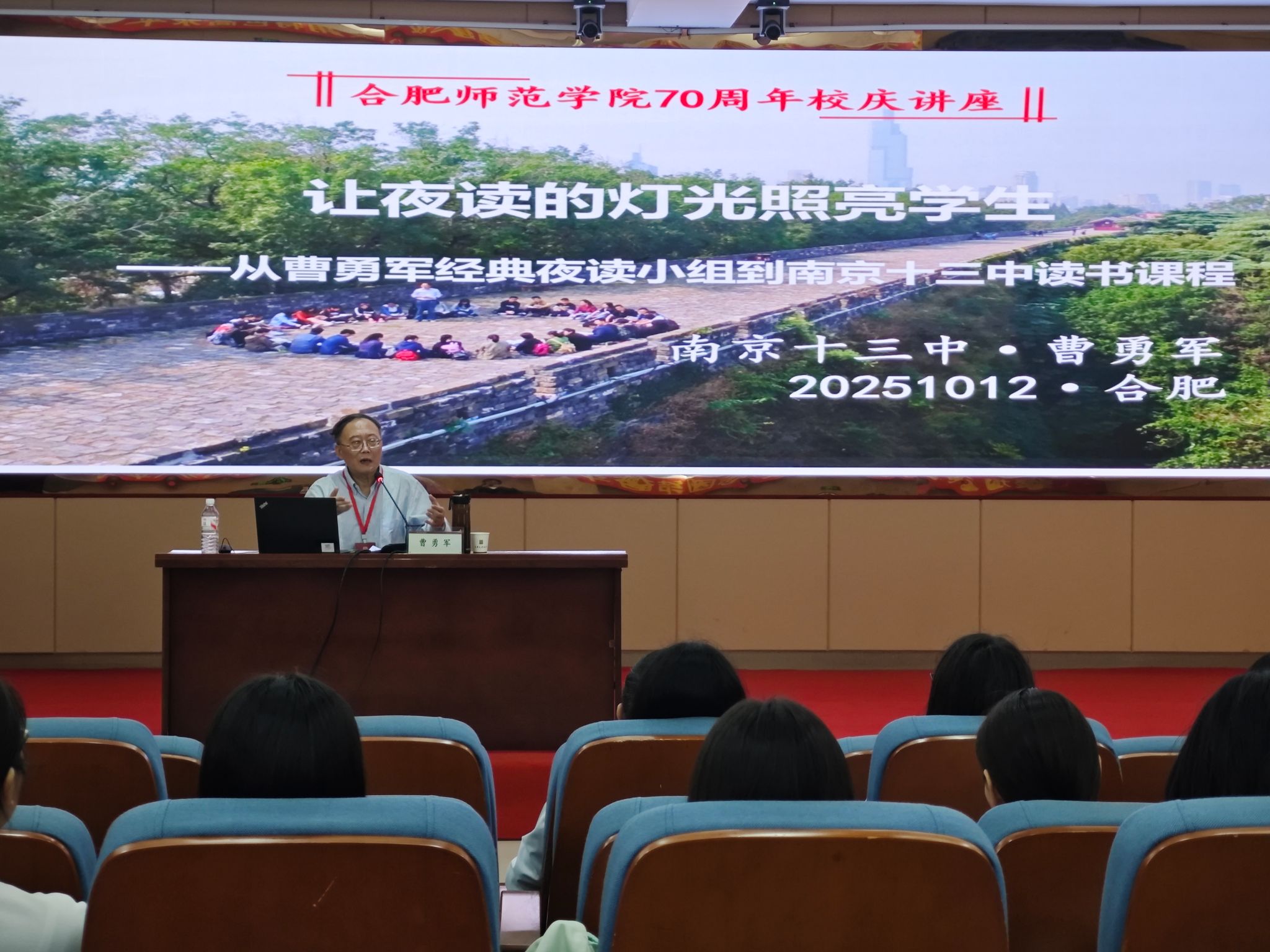 10月12日下午,由合肥师范学院科研处和黄色片免费看联合主办的70周年校庆学术讲座活动在锦绣校区学术报告厅举行。黄色片免费看1986届校友,江苏省特级教师、南京市十三中教授级高级教师曹勇军作了题为“让夜读之光照亮学生——从曹勇军经典夜读小组到南京十三中读书课程”的学术讲座。学院2024级、2025级学科语文教育硕士研究生和部分汉语言文学专业本科生参加讲座,讲座由黄色片免费看院长何旺生主持。