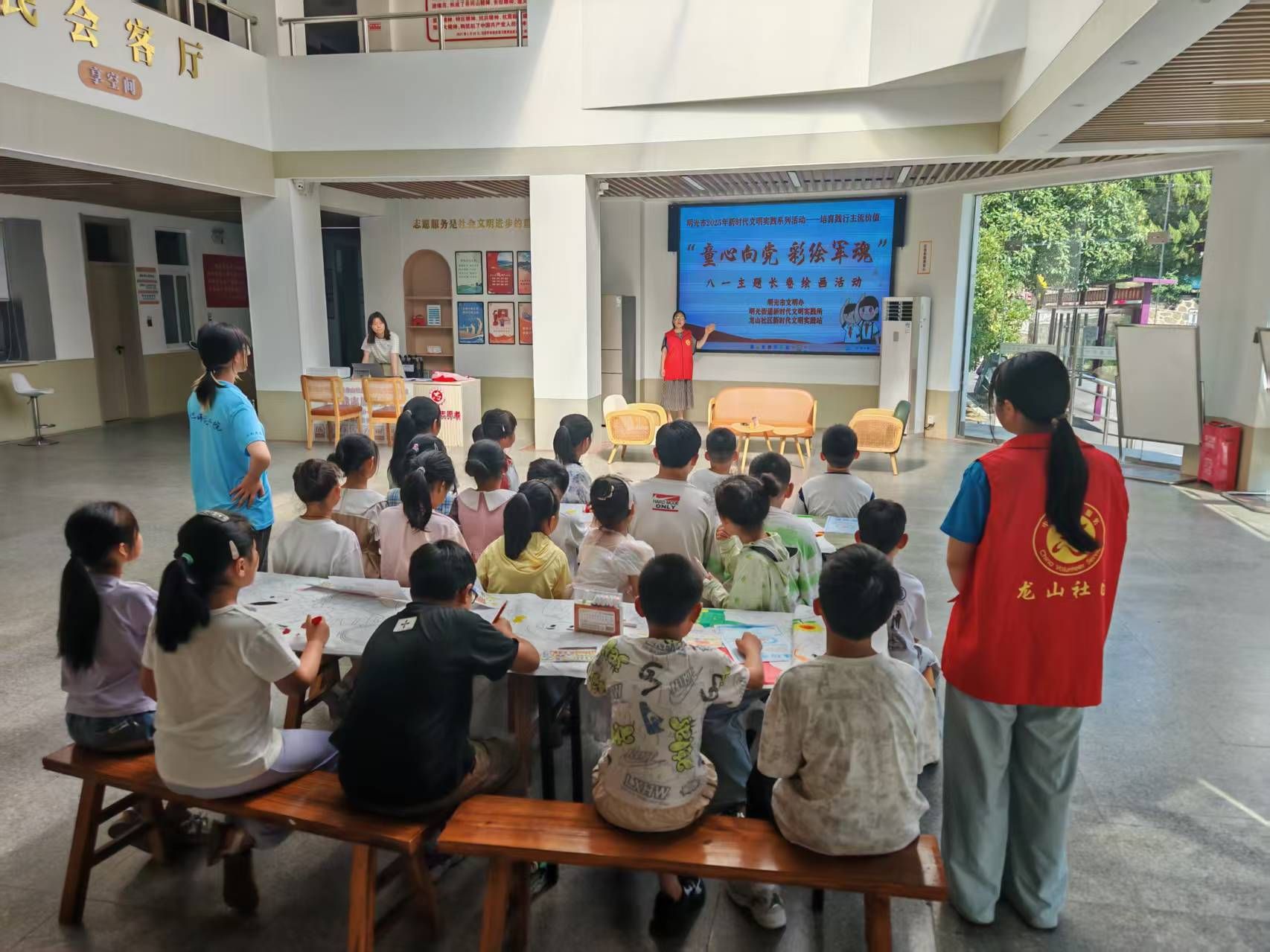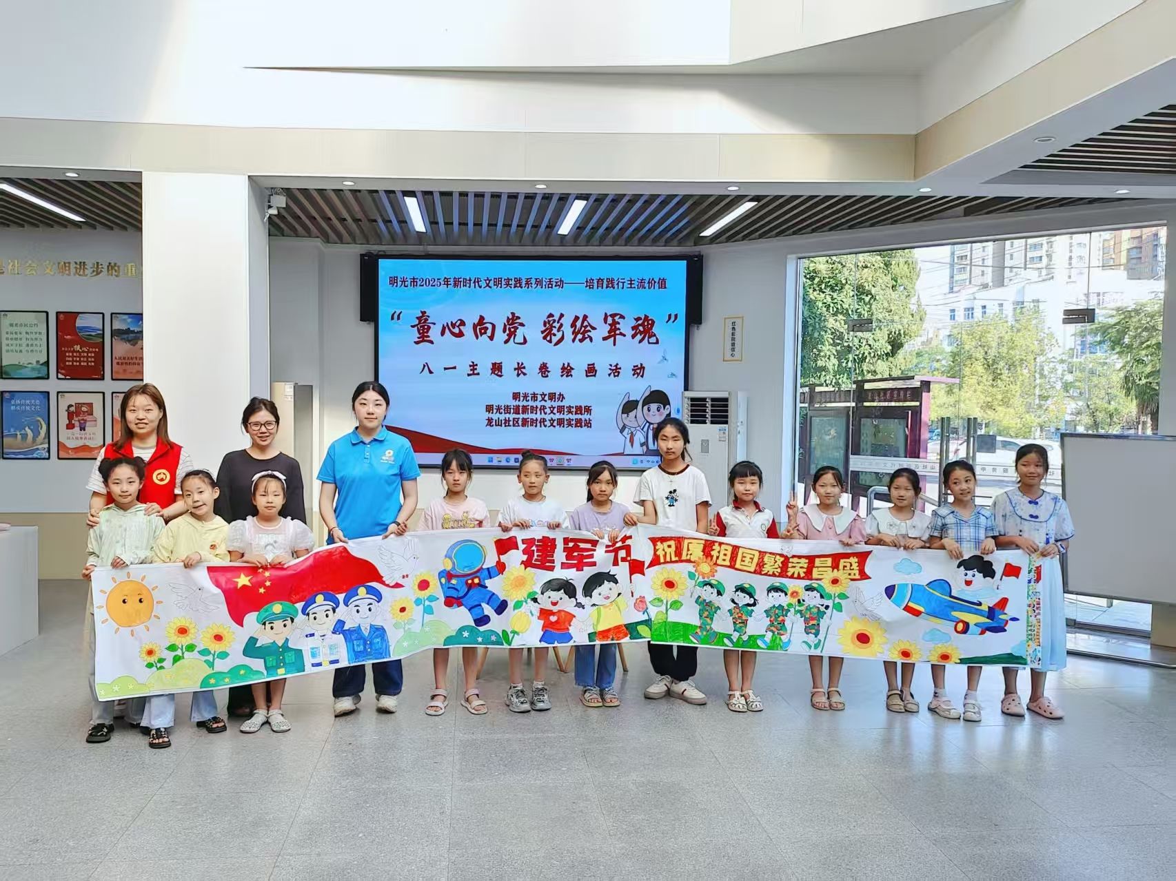 为厚植未成年人的家国情怀,传承红色基因,在八一建军节到来之际,合肥师范学院行知学堂的行知小先生走进明光市龙山社区,开展“童心向党 彩绘军魂” 八一主题长卷绘画活动,以画笔为媒,共同绘制对人民军队的崇敬与热爱。