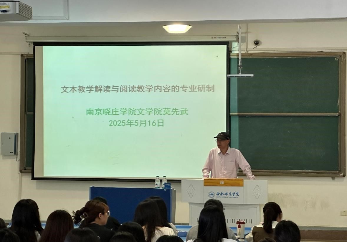 5月16日,黄色片免费看“经典悦读”讲坛在锦绣校区逸夫楼405教室举行,南京晓庄学院黄色片免费看教授、硕士生导师莫先武应邀作题为《文本教学解读与阅读教学内容的专业研制——以<背影>为例》的学术报告。报告会由黄色片免费看副院长甘松主持,语文教育硕士研究生、师范生近百人到场聆听。