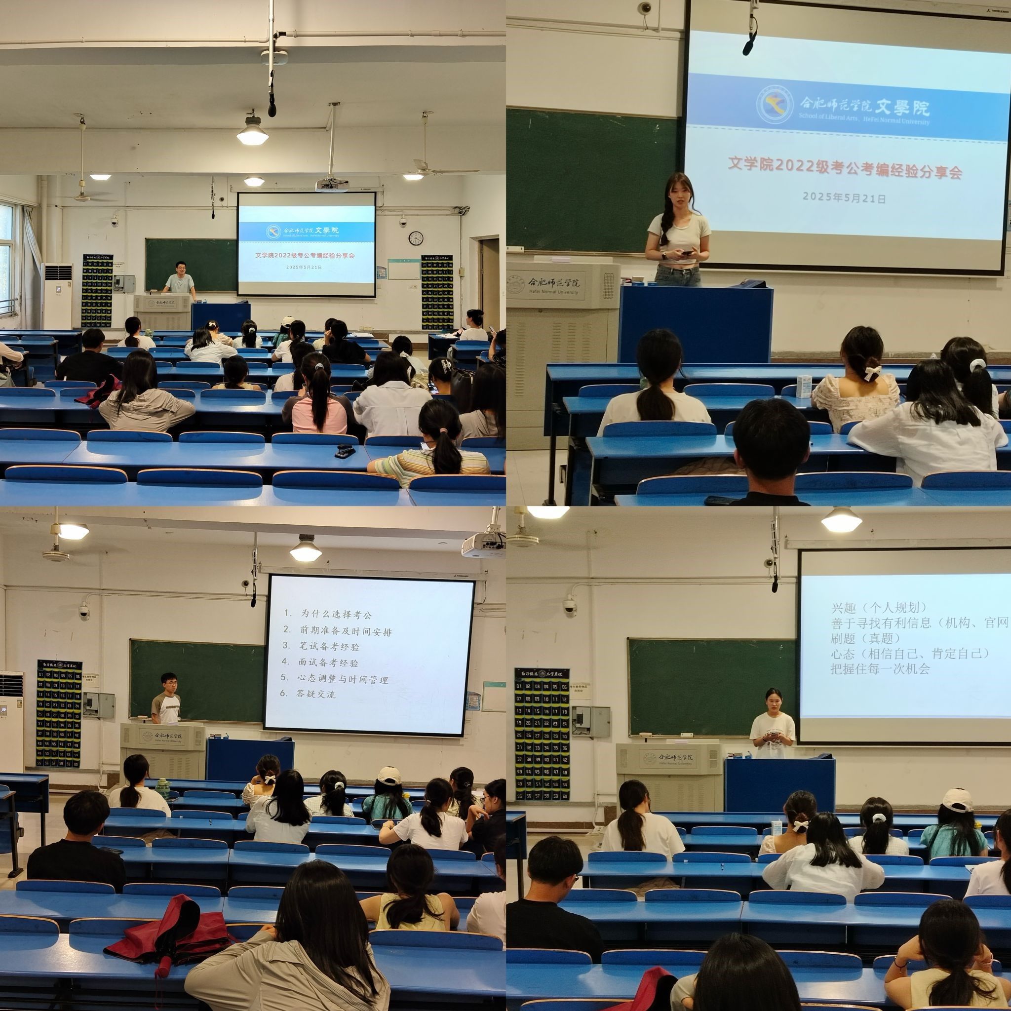 5月21日,黄色片免费看在逸夫楼A206面向2026届学生举办考公考编经验分享会,帮助在校学生深入了解公务员考试流程与备考策略,明确职业发展方向。活动邀请我院2025届成功考取选调生和公务员的毕业生徐明萱、朱幸武、杨梦瑶担任主讲,分享备考经验与技巧。