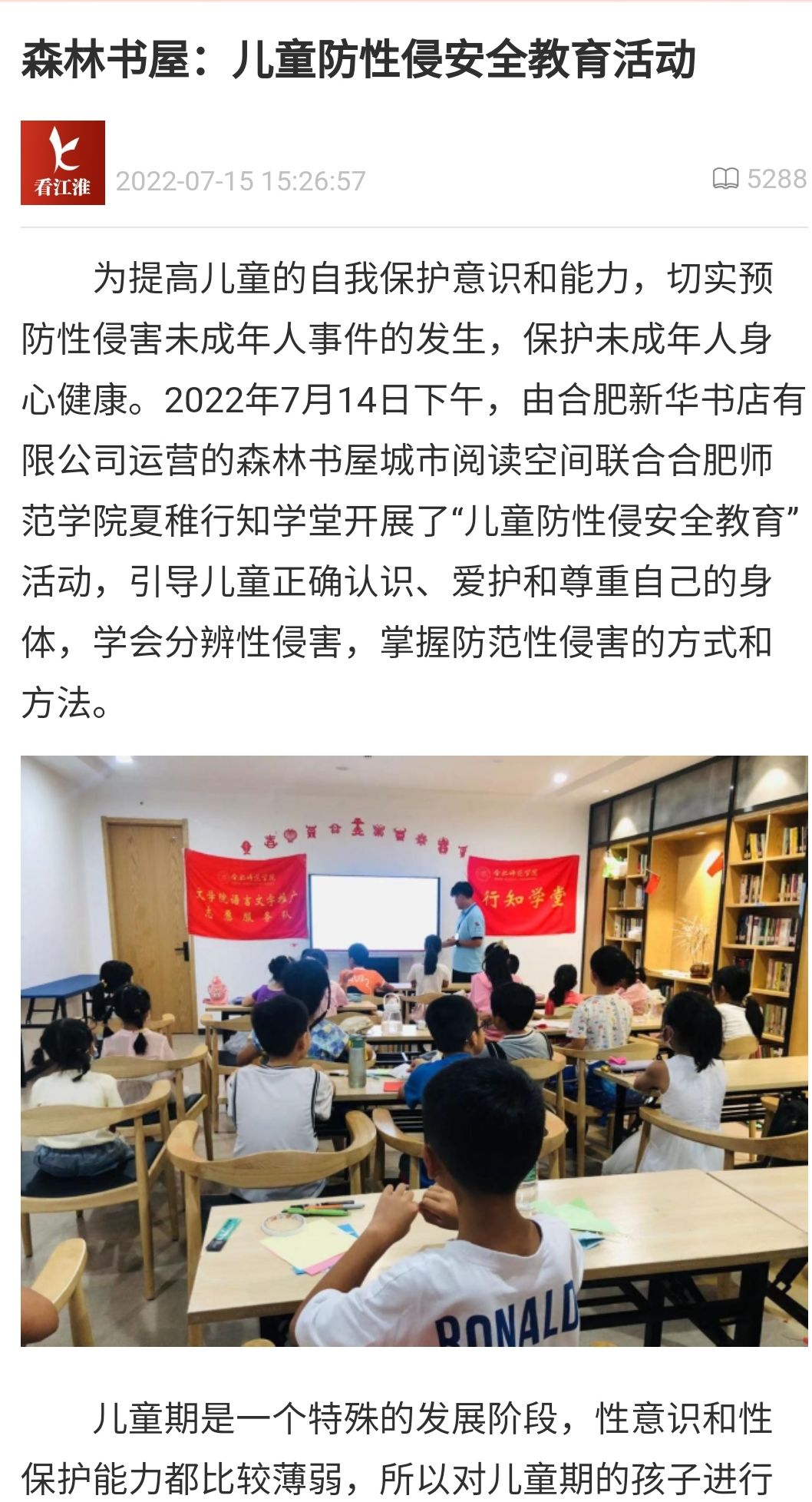 2022年7月4日下午,合肥市经开区森林树屋联合合肥师范学院夏稚行知学堂开展“儿童防性侵害安全教育”活动,引导儿童正确认识、爱护和尊重自己的身体,学会分辨性侵害的类型,掌握防范性侵害的方式和方法。