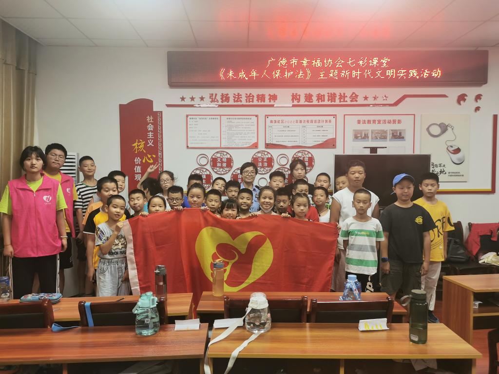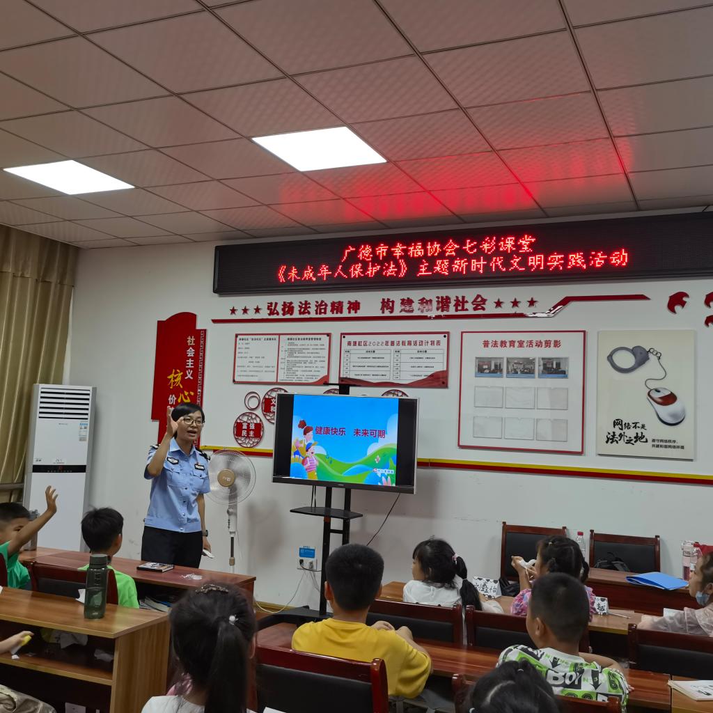 为进一步增强未成年人法治观念,提高未成年人自我保护意识,2022年7月15日在黄色片免费看“七彩行知学堂”(南塘社区)展开《未成年人保护法》主题教育活动。出席此次活动的有广德市公安局陈丽娟警官、广德幸福协会的志愿者以及32位学生。